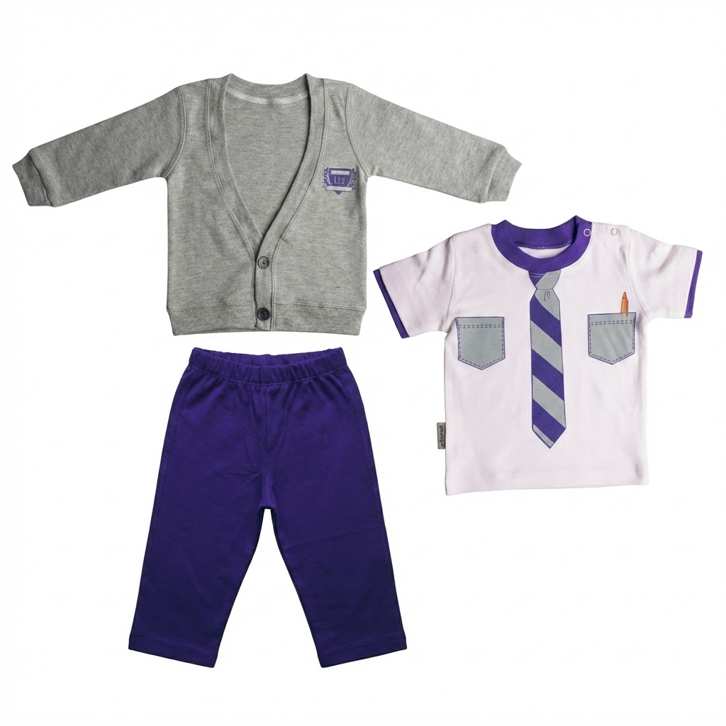 این ست نوزادی شیک و راحت، شامل تی‌شرت آستین کوتاه با طرح کراوات، شلوار ساده و ژاکت دکمه‌دار است. جنس نرم و باکیفیت آن، راحتی و آزادی حرکت کودک شما را تضمین می‌کند و انتخابی ایده‌آل برای استفاده روزمره و مهمانی‌هاست.